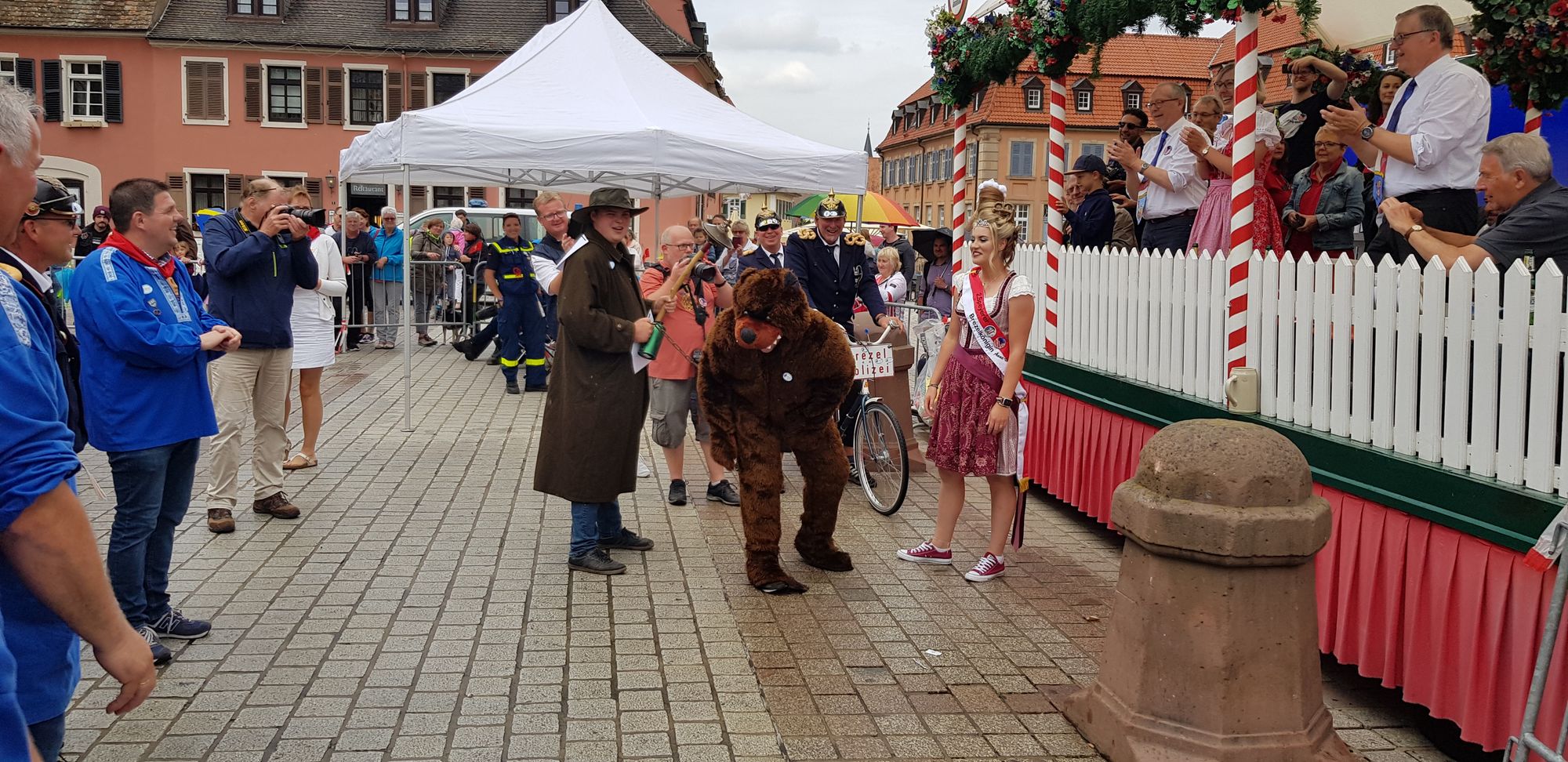 Am Sonntag war es dann soweit, der Höhepunkt des Wochenendes stand auf dem Programm. Wir waren Wagen bzw. Fußgruppe 26 von 85. Begleitet von der Brezelpolizei mit Ihren Fahrzeugen nahm unserer Truppe beim großen Umzug durch Speyer teil und sorgte wieder für beste Stimmung bei den Zuschauern am Rand. Dafür sorgten natürlich auch unser Bär Nils Hetkämper-Flockert sowie der Ersatzbärenleier Jan Stenkamp. Der Bär ließ es sich auch nicht nehmen und legte vor der Bühne einen Tanz mit der neuen Brezelkönigin aus Speyer hin. Nach dem Umzug bei typischen Brezelwetter ließen wir den Tag gemeinsam mit unseren Gastgebern vom Verkehrsverein Speyer rund um das Festzelt ausklingen.