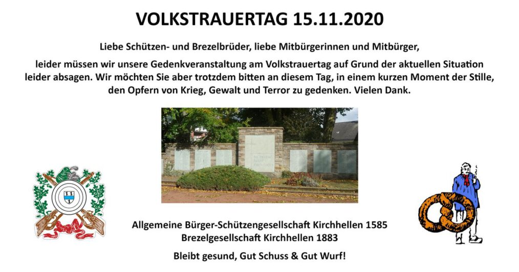 Leider kann die traditionelle Gedenkfeier zur Totenehrung am Sonntag, 15.11.2020 auf Grund der aktuellen Situation nicht wie geplant stattfinden. Trotzdem möchten wir Sie bitten an diesem Tag, in einem kurzen Moment der Stille, den Opfern von Krieg, Gewalt und Terror zu gedenken. Der Volkstrauertag wurde 1919 vom Volksbund Deutscher Kriegsgräberfürsorge zum Gedenken an die Opfer des ersten Weltkrieges eingeführt. Nicht nur in der Vergangenheit, auch in der Gegenwart werden wir leider immer noch mit Gewalt konfrontiert. Seit einigen Jahren wird die Veranstaltung in Kirchhellen gemeinsam von den Vorständen der Allgemeinen Bürger-Schützengesellschaft Kirchhellen und der Brezelgesellschaft Kirchhellen veranstaltet und von zahlreichen Kirchhellener Bürgerinnen und Bürgern besucht.