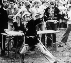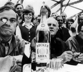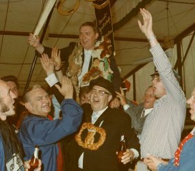 Mehr als 1.200 Brezelbrüder hatten sich bis zum Beginn des Brezelwerfens in die Listen eintragen lassen. Eine solche Rekordbeteiligung gab es vorher noch nie. Der Riesenbrezel vertrug manch argen Stoß, bevor ihm Bäckermeister Egon Schnieder „den Garaus machte“. Hallo und Händedrücken für den neuen Brezelkönig Egon I., der sich lrmgard Strangemann aus Ekel zur Königin erkor.